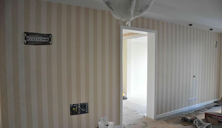 12、铺贴壁纸,贴壁纸对房间的污染还是比较大的,有条件的话,铺贴壁纸的当天,地板应该做一下保护;应该还牵涉到家电五金的安装,比较繁琐,所以也需要工人更细致些。