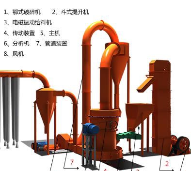 大块物料经破碎后由提升机送入储料仓,再由电磁振动给料机均匀地送入主机研磨室,进入磨室的物料被铲刀铲起,进入磨辊与环之间被碾压搓碎,风机将风吹入磨室内,吹起粉末带入分析机内,进行分选,达不到细度的又落研磨室重唐,合格细粉则随气流进入成品旋风集粉器,细粉与空气分离后从卸料口排出即为成品,而空气从上端回风管返回风机内,风路是循环的,并且是在负压状态下流动。