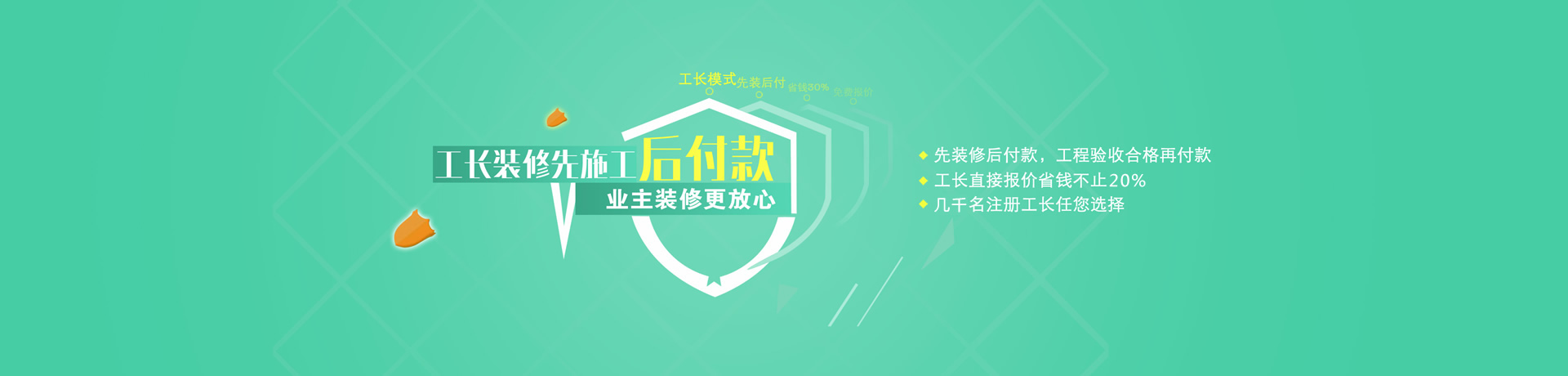 在优优工长选择工长,家装业主可参考“先施工后付款”的方案,付500-1000元合同定金即可开工,做一项验收合格付一项的款,付款更安心,业主把握主动权。