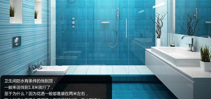 卫生间防水有条件的做到顶, 一般来说做到1.8米就行了, 至于为什么?因为花洒一般都是装在两米左右, 防水做这么高是为了保证人在洗澡的时候,溅水到墙上。