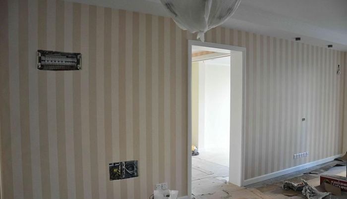 12、铺贴壁纸,贴壁纸对房间的污染还是比较大的,有条件的话,铺贴壁纸的当天,地板应该做一下保护;应该还牵涉到家电五金的安装,比较繁琐,所以也需要工人更细致些。
