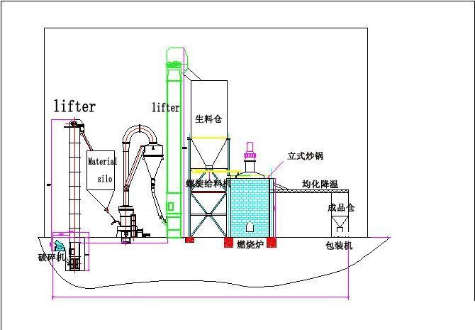 大块物料经破碎后由提升机送入储料仓,再由电磁振动给料机均匀地送入主机研磨室,进入磨室的物料被铲刀铲起,进入磨辊与环之间被碾压搓碎,风机将风吹入磨室内,吹起粉末带入分析机内,进行分选,达不到细度的又落研磨室重唐,合格细粉则随气流进入成品旋风集粉器,细粉与空气分离后从卸料口排出即为成品,而空气从上端回风管返回风机内,风路是循环的,并且是在负压状态下流动。