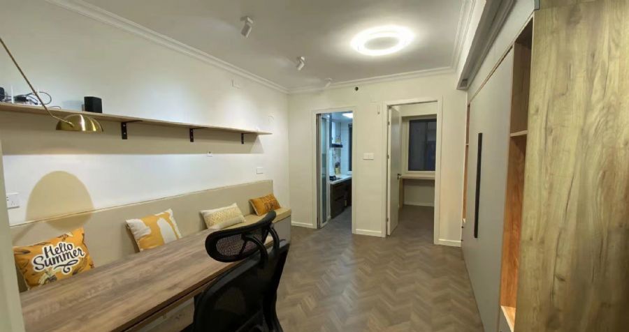 一进门口左手边给隔出一个鞋柜,然后是开放式的厨房,做了隔断,冰箱那边放了一个高柜