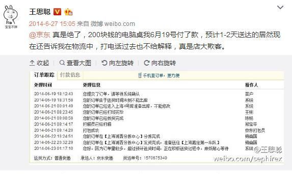 | 店大欺客?故事要从王思聪在京东买了一张199元的电脑桌却迟迟未收到货说起!